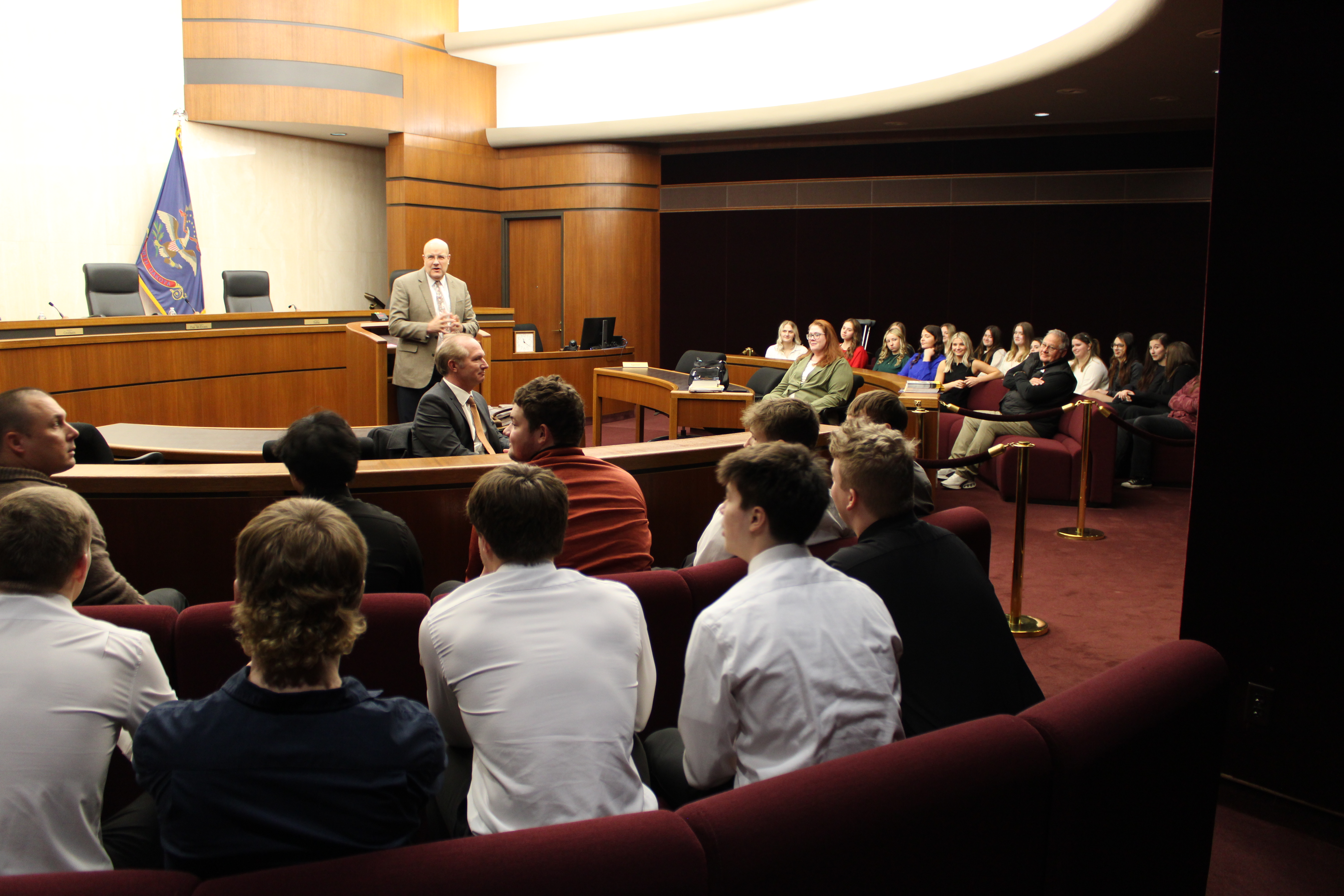 Harvey High School students listened to live oral arguments and visited with Justice Bahr and attorneys