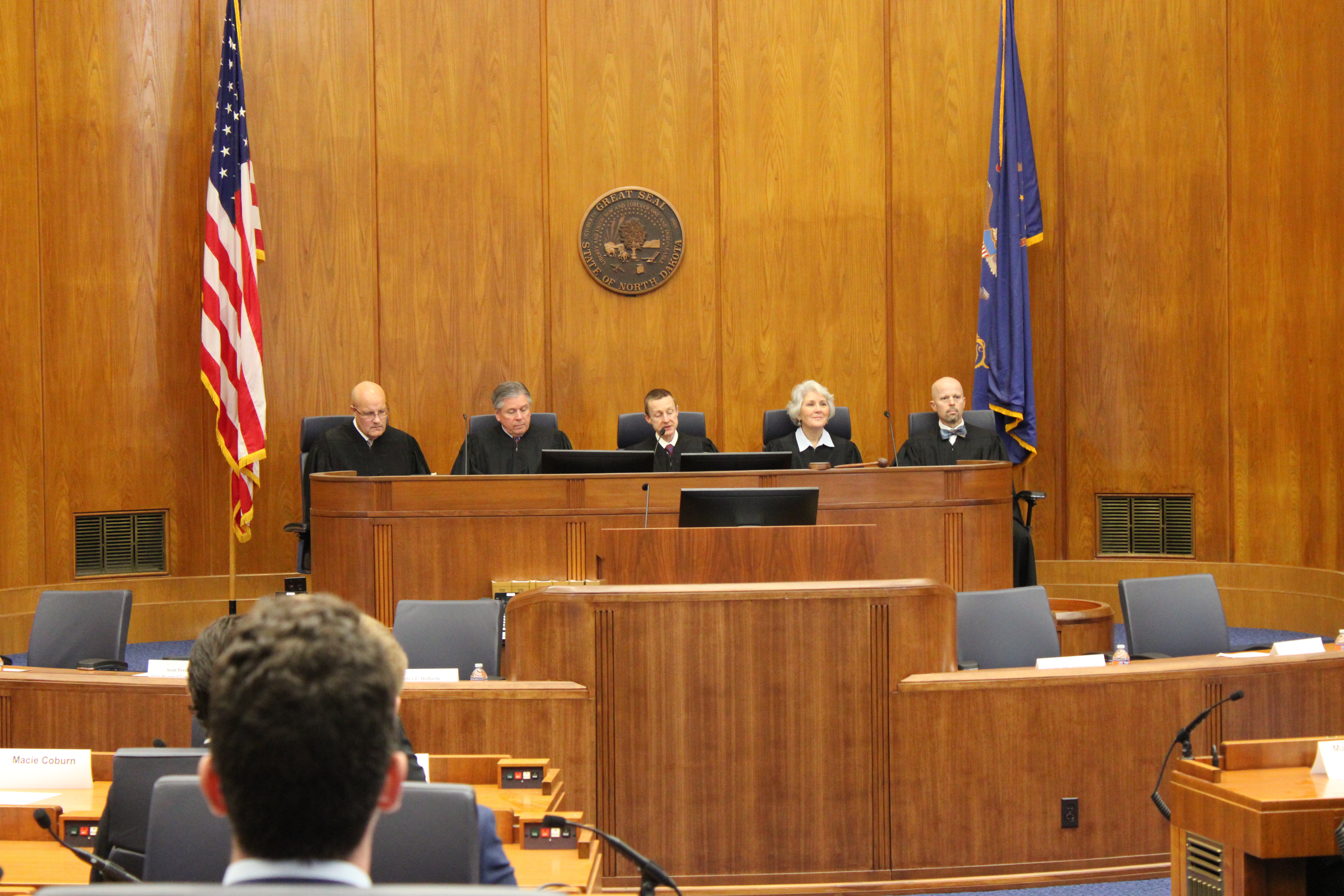 From Left to Right: Justices Douglas Bahr, Daniel Crothers, Chief Justice Jon Jensen, Justices Lisa McEvers, and Jerod Tufte welcome attendees and guests to the Fall Bar Admission Ceremony in the House Chambers of the state capitol.