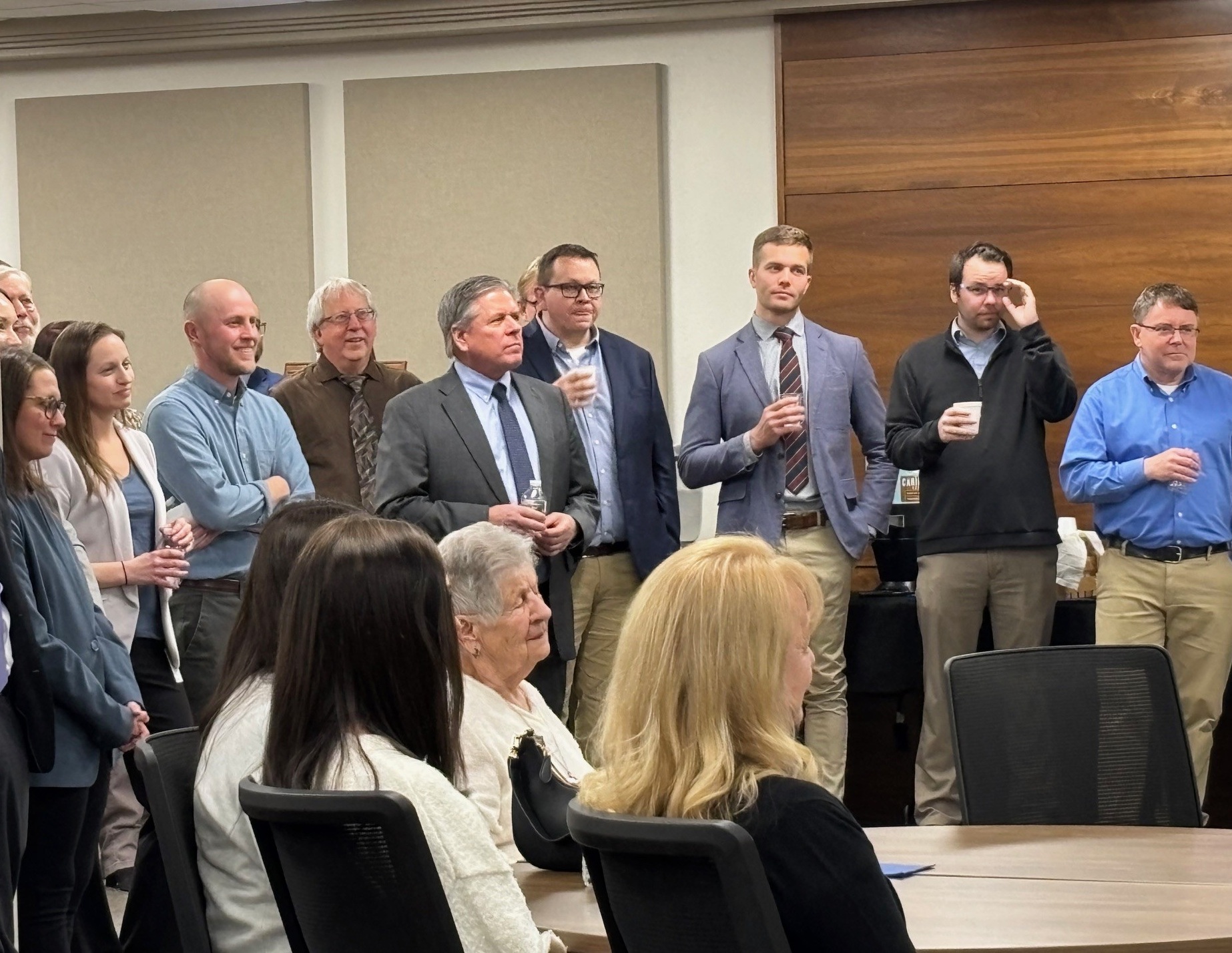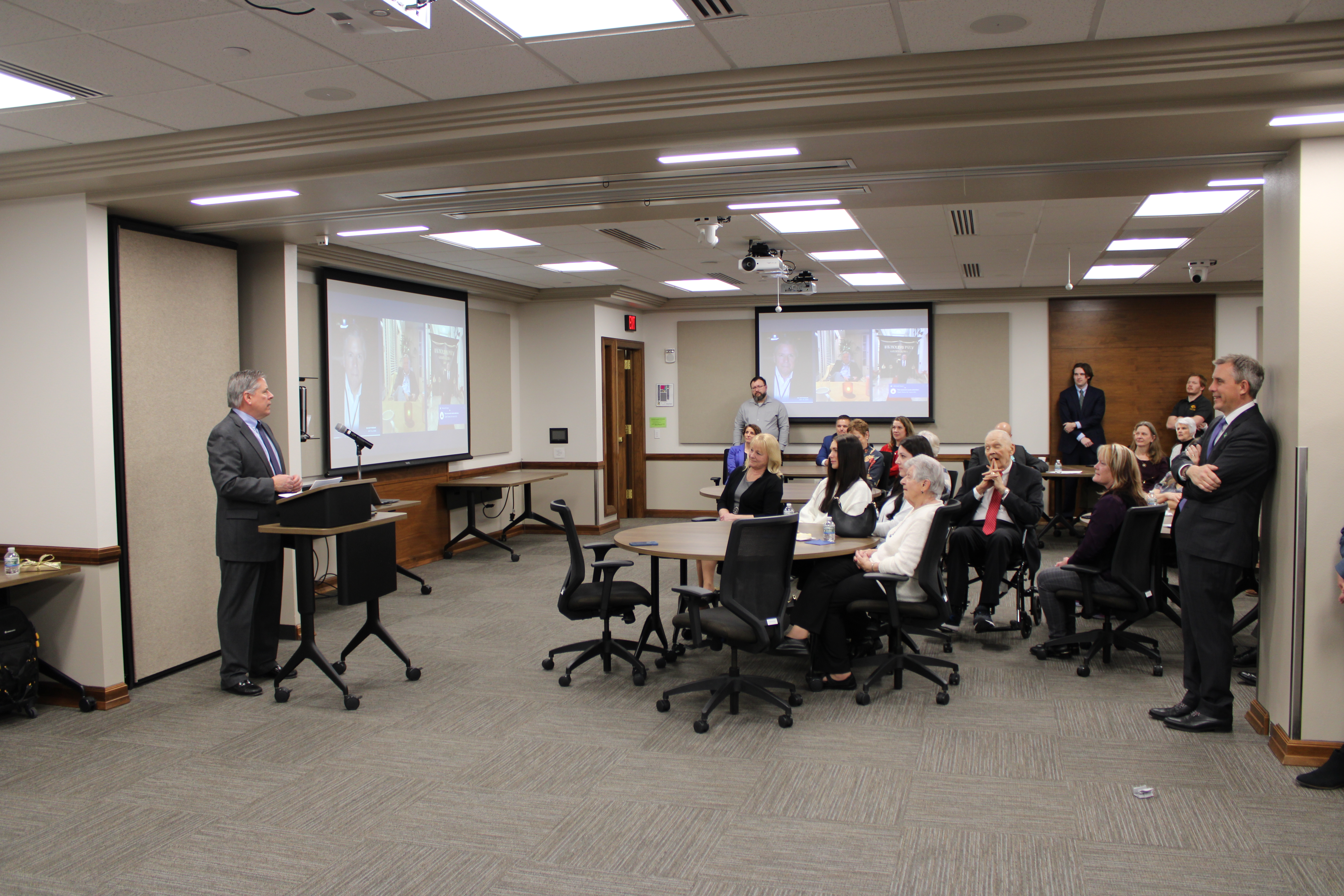 Justice Daniel Crothers, left, makes remarks to attendees, including Governor Kelly Armstrong and retired Chief Justice Gerald VandeWalle. Justice Crothers noted that the work of the courts could not be done without the help of people behind the scenes, from Clerks of Court to law clerks to his administrative assistants, Pat Walsh (retired) and Sue Hartley.
