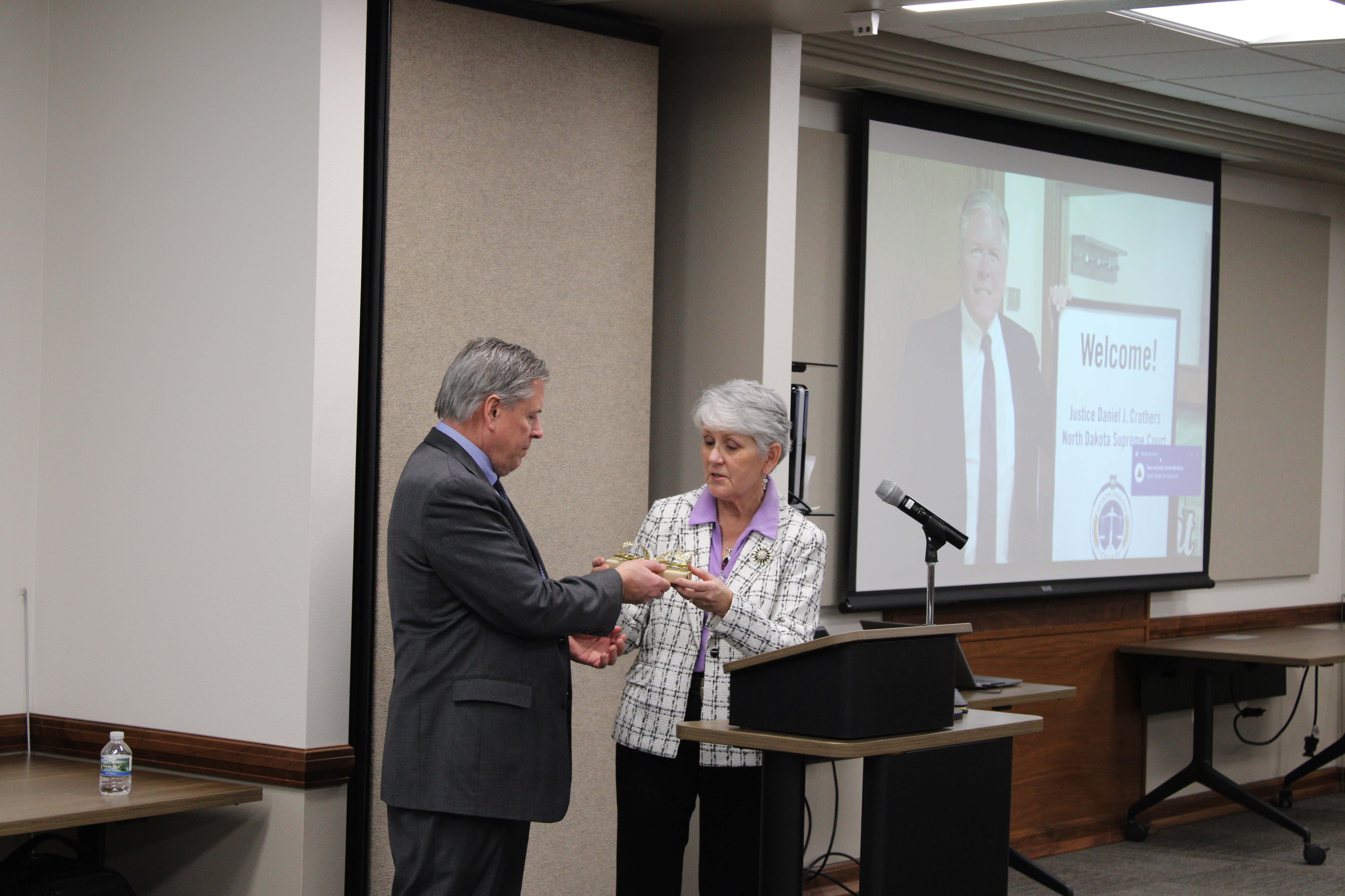 Chief Justice Fair McEvers presents Justice Crothers with a gift from members of the judiciary.